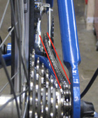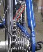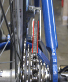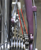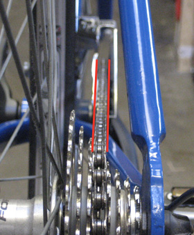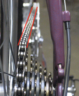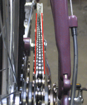 The following three images illustrate normal variations in chainline, demonstrated on a bike with a single front chainring. Click on the images for larger versions and further detail.